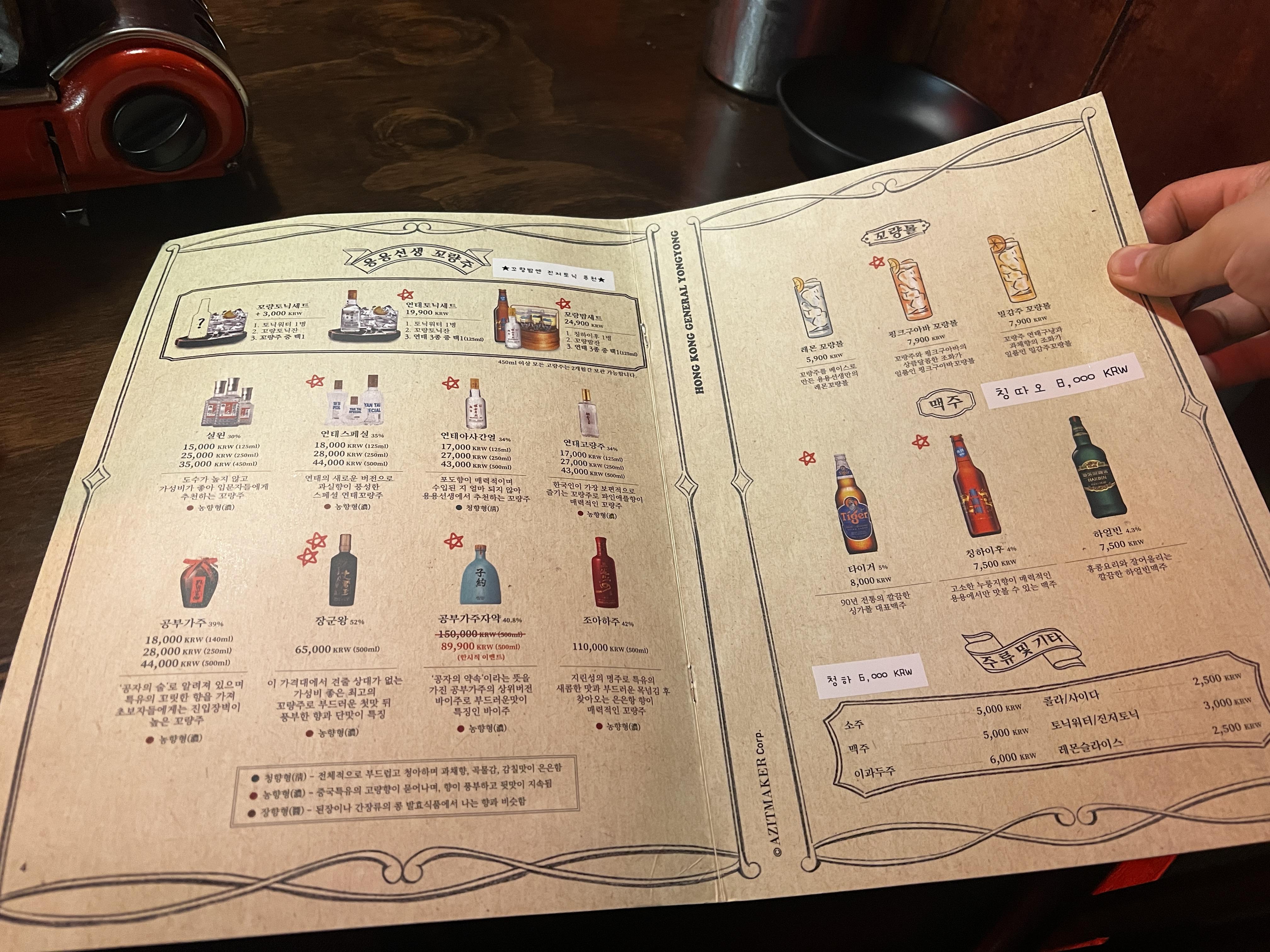 고량주가 종류별로 많이 판매되고 있고, 연태고량주와 토닉워터가 구성되어 있는 세트메뉴도 있네요.