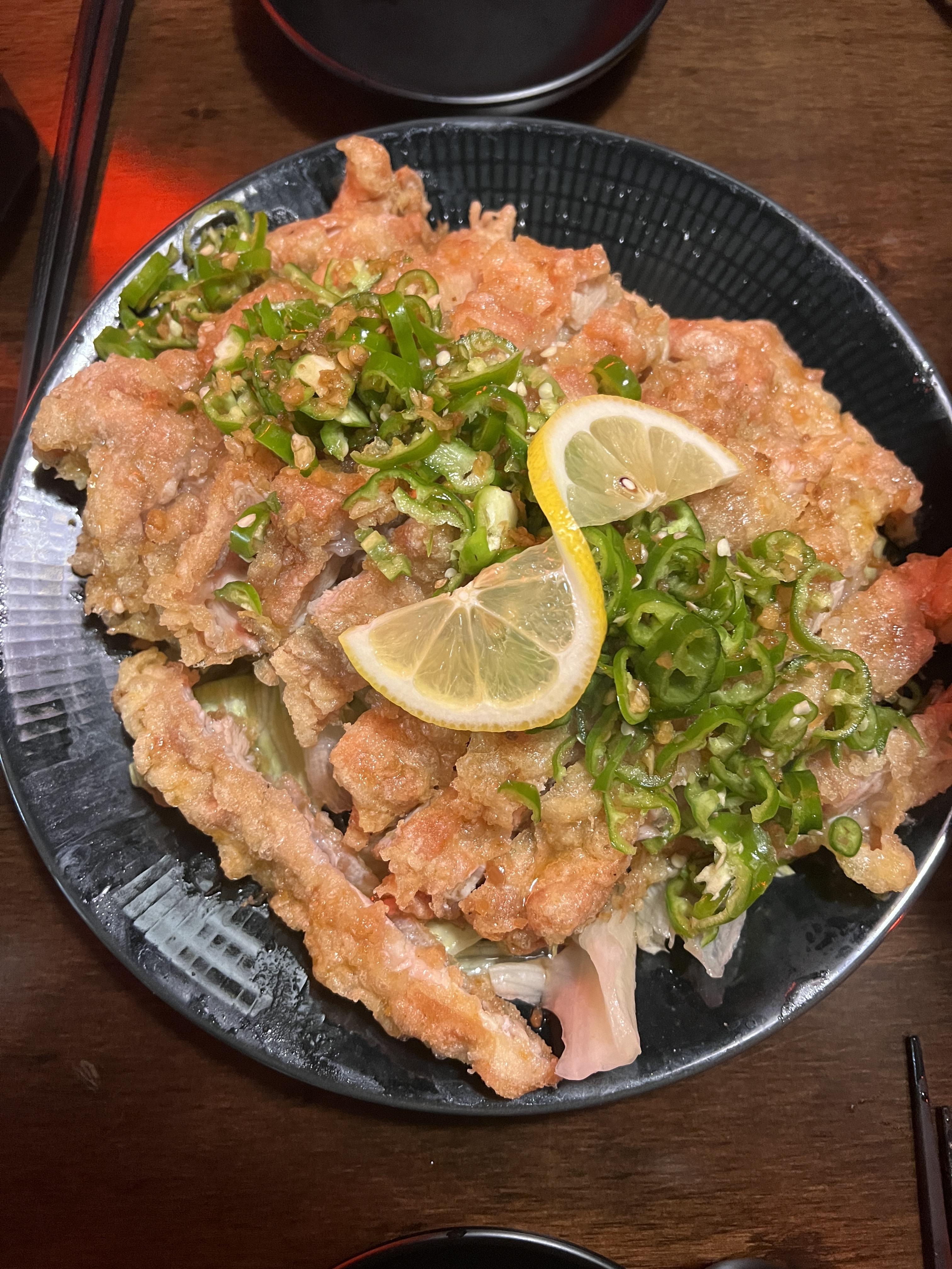 겉바속촉 닭튀김과 아삭한 청양고추와 양상추가 어우러져 있습니다.
