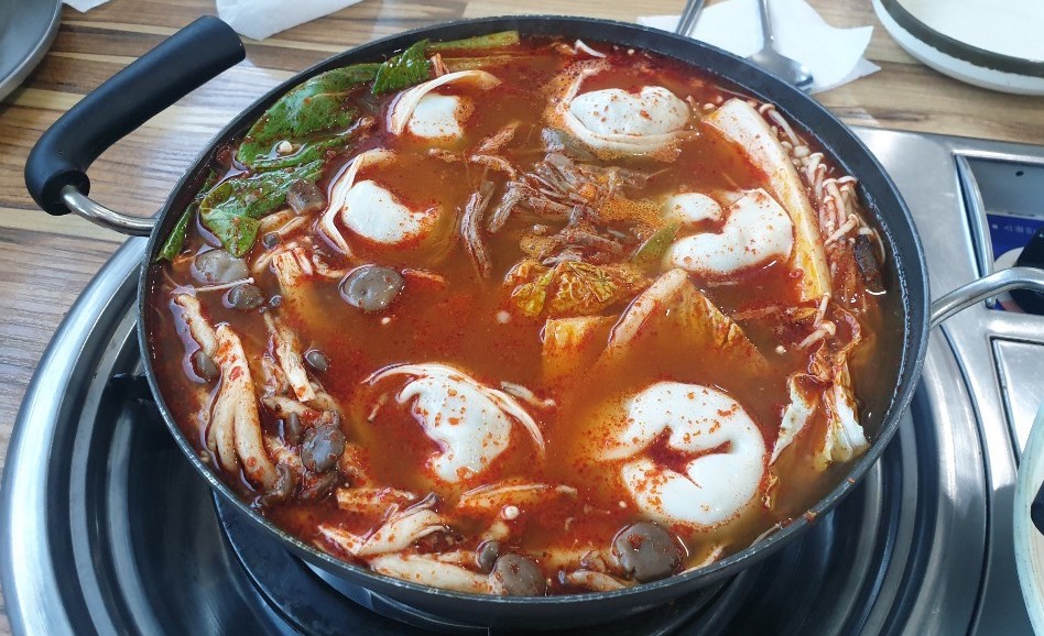 강화도 맛집 칼국수 맛있는집의 시그니처 메뉴 육개장 만두전골(소:28,000원)이 나왔습니다.
